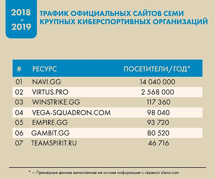 Согласно примерным данным, которые вычислены на основе информации с сервиса alexa.com, видно огромный разрыв между организациями. Впереди планеты всей идут Natus Vincere, которые определенно умеют приводить людей на основной ресурс организации, следом идут Virtus.Pro. А дальше видна пропасть.