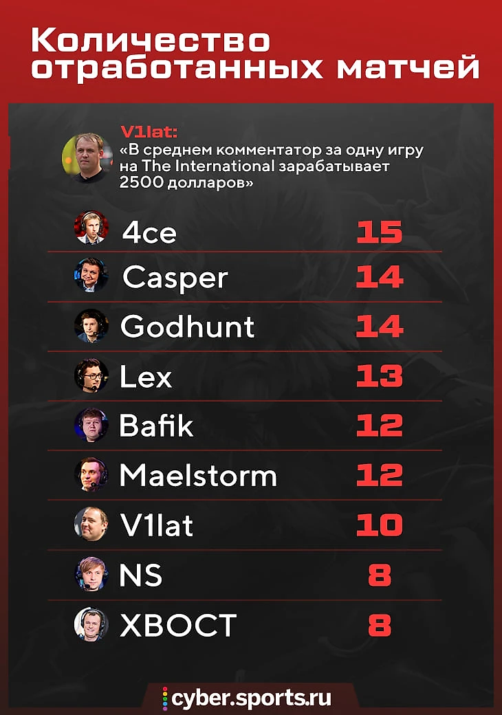 В интервью блогу «КраСава» Вилат рассказал, сколько комментаторы получают за матч на The International: «Зависит, конечно, от количества игр, которые ты комментируешь. Но в среднем комментатор за одну игру на The International зарабатывает 2,5 тысячи долларов. Англоязычные коллеги зарабатывают в 2,5 раза больше».