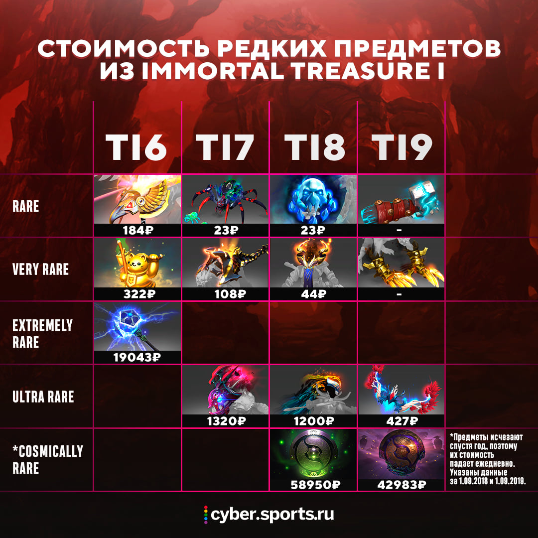 Сравним редкие предметы из первых сокровищниц TI6, TI7, TI8 и TI9. В Боевых пропусках несколько Immortal Treasure I выдают раньше вторых и третьих, так что сундуки получают люди, задонатившие лишь на сам компендиум. Учтем стоимость предметов на торговой площадке Steam, как правило, она на несколько процентов больше стоимости в запросах на покупку.