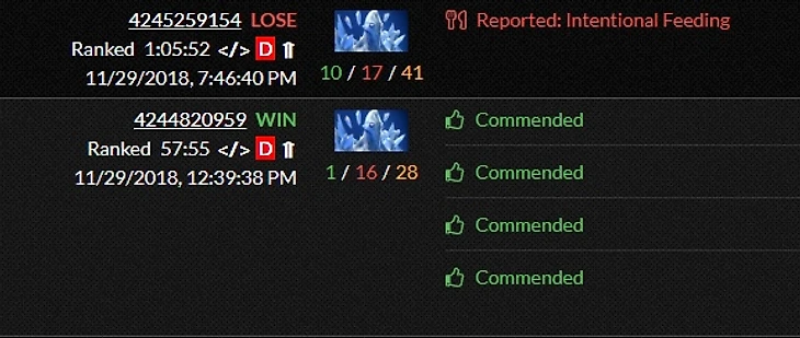 Самое забавное в том, что если отсортировать игры по победам и поражениям, то 90% моих репортов придется на проигранные матчи. Какая же дерьмовая система.