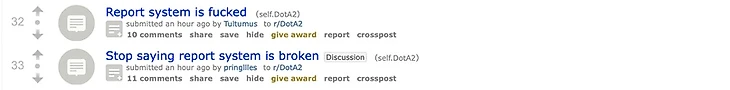 Доте очень сильно нужен «репорт MMR». Если кто-то редко репортит, то пусть их репорты засчитываются. Если они репортят постоянно, всех подряд, и статистика не подтверждает их репорты, то пусть их жалобы ничего не стоят. Уберите максимальное количество репортов. Так можно будет вычислить идиотов, которые репортят всех подряд, и не засчитывать их жалобы.