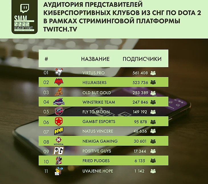 •Первое место – Virtus.Pro. У них 29,04% подписчиков от аудитории всех команд.