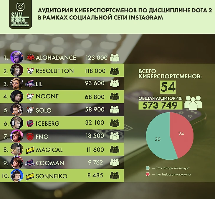 Инстаграмом киберспортсмены пользуются значительно меньше — лишь чуть больше половины от всех рассматриваемых игроков. Видимо, сказывается некоторая закрытость и ассоциальность, которая свойственна киберспортсменам.