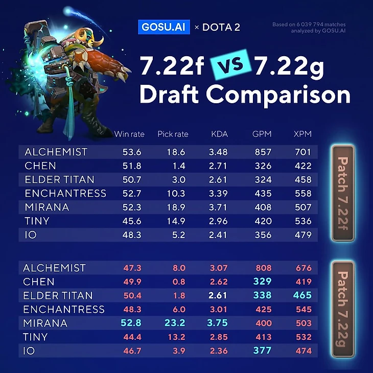 Вчера мы наконец-то получили новый патч - 7.22h. Отличная возможность посмотреть на результативность предыдущего - 7.22g? Сегодня мы сравним его с предшественником - 7.22f.