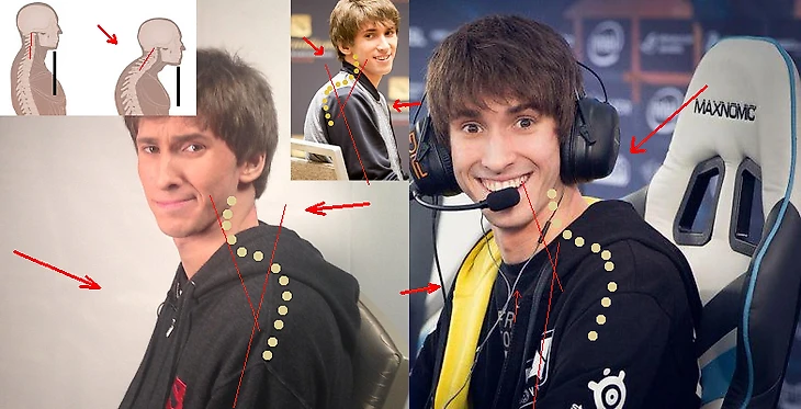 В то время, как левая рука спортсмена в большинстве случаев неподвижно зафиксирована упором запястья в стол перед клавиатурой, правая рука определённым образом подвешивается на опущенном относительно вертикальной оси симметрии плече - на фоне статично перенапряжённой левой трапециевидной мышцы и расслабленной правой. Кроме того, спортсмен рефлекторно стремится минимизировать дыхательную активность верхней доли правого лёгкого, т.к. таковая наиболее ощутимо сбивает ему точность наведения курсора на цель (дано для правши).