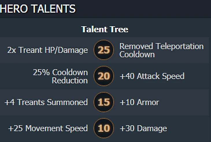 · Когда живы все пять энтов, они дают ауры союзным героям (и только героям!) на +2 брони, +15 урона, +15 скорости атаки, +5% к урону от заклинаний в радиусе 900. При смерти каждого энта отнимается одна из аур.