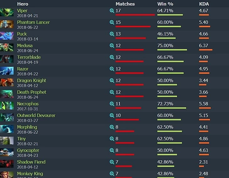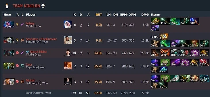 Напомним, что до Team Secret Nisha играл в польских командах Team Singularity и Team Kinguin, и играл именно миде. По факту именно он был основной силой команды в лейте, и именно ему отдавали фарм. Посмотрим на его пул героев в Kinguin: