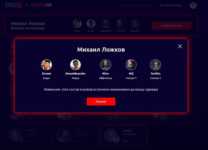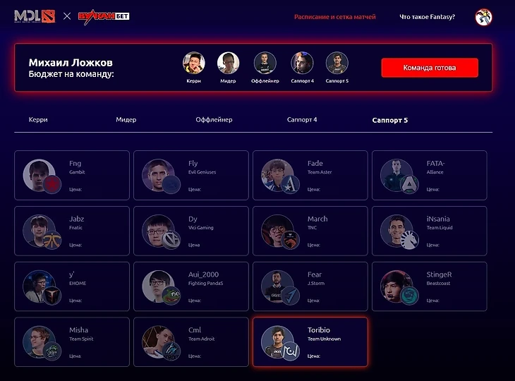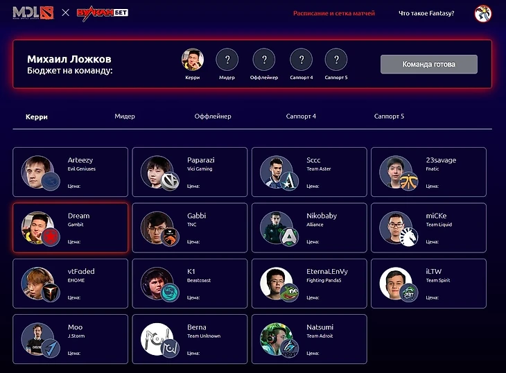 • Выбираете игроков из списка (доступны все 80 участников мейджора).