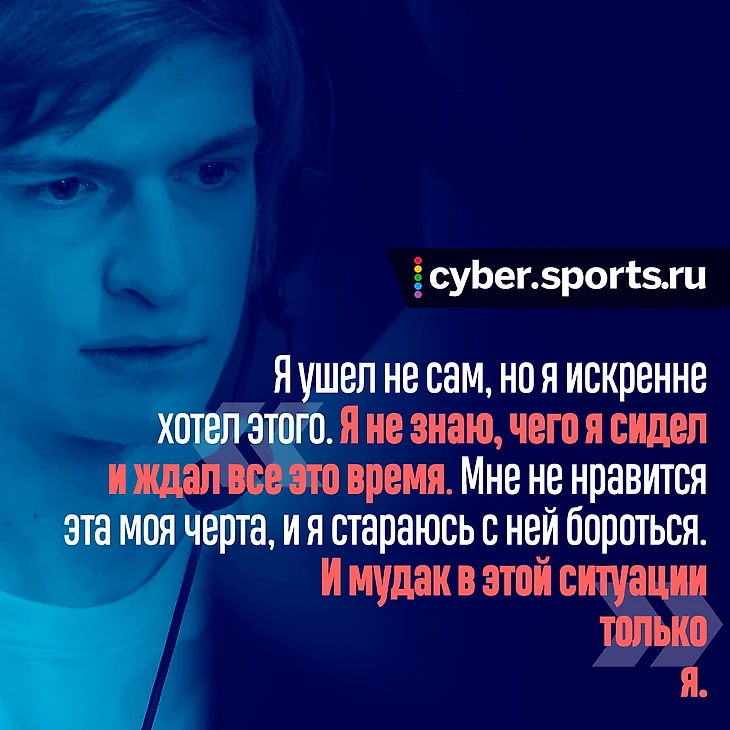 Я ушел не сам, но я искренне хотел этого. Я не знаю, чего я сидел и ждал все это время. Это «я не знаю» длилось для меня месяцев шесть или восемь. Я понимаю, что это проблема. Мне не нравится эта моя черта, и я стараюсь с ней бороться. И мудак в этой ситуации только я.