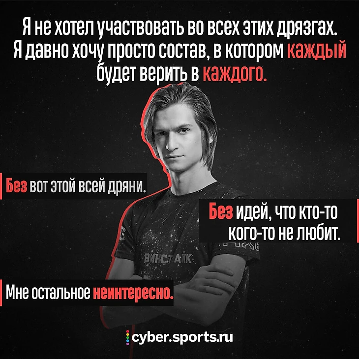 Я не хотел участвовать во всех этих дрязгах. Я давно хочу просто состав, в котором каждый будет верить в каждого. И где каждый будет помогать друг другу развиваться. Без вот этой всей дряни. Без идей, что кто-то кого-то не любит. Мне остальное неинтересно.