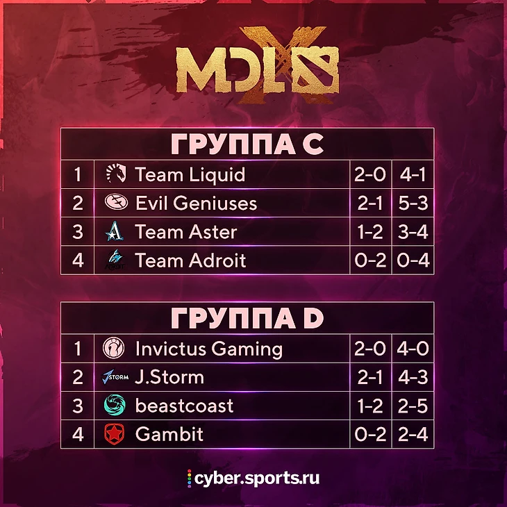 15:30 Evil Geniuses 2:1 Team Aster / матч за второе место в группе C15:30 J.Storm 2:1 Beastcoast / матч за второе место в группе D