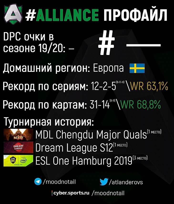 Alliance собрались буквально за несколько дней до начала отборочных к предстоящему мажору, однако сходу заявили о себе как о сильном и перспективном коллективе: они без проблем прошли на MDL, после выиграли 12 сезон Dream League и заняли 3-е место на недавнем ESL One Hamburg.