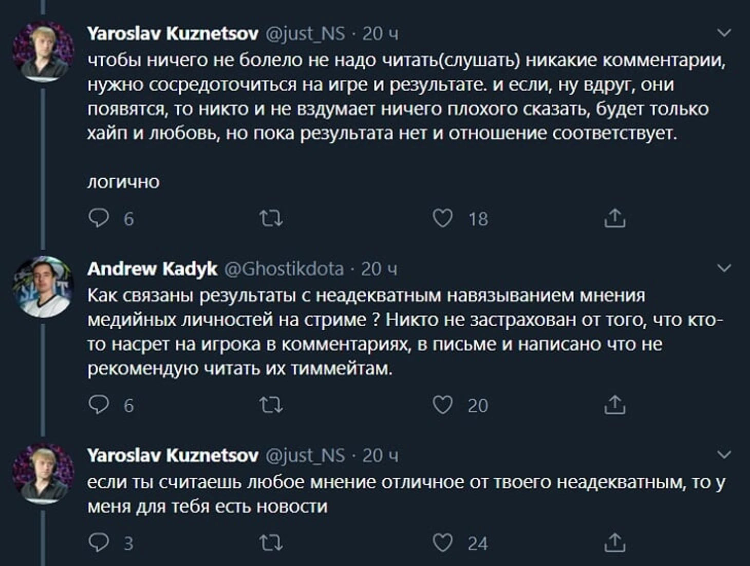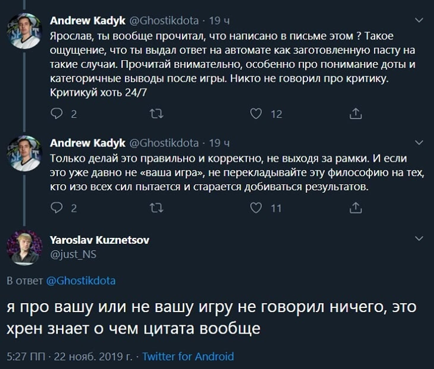 В субботу на нашем сайте вышло «Открытое письмо» с Гостиком, оффлейнером Team Spirit. Уникальный случай, когда игрок сам захотел высказаться перед аудиторией – огромный респект Андрею за это. Ожидаемо, не всем понравились слова, сказанные Гостиком в письме – самым медийным из недовольных людей стал Ярослав «NS» Кузнецов. Все началось со спора в Твиттере:
