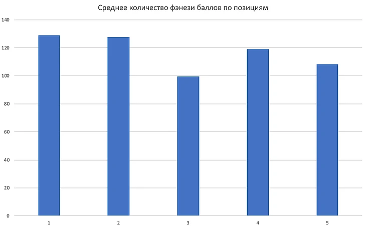 По этому графику мы видим, что первая и вторая позиция в среднем набирали больше оффлейнеров на 30 баллов (наверное, на длинной дистанции турнира это скажется).