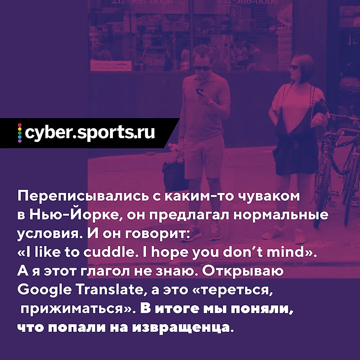А когда мы с женой в 2010 году поехали в Нью-Йорк первый раз в отпуск, то воспользовались сайтом couchsurfing, где можно подселиться к кому-то. Переписывались с каким-то чуваком, он предлагал нормальные условия. И говорит: «I like to cuddle. I hope you don’t mind». А я этот глагол не знал. Открыл Google Translate, а это «тереться, прижиматься». В итоге мы поняли, что попали на извращенца и забронировали какой-то недорогой отель.