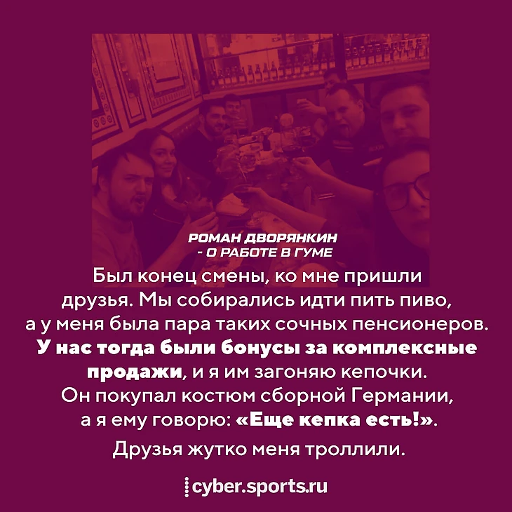 Я просто помню, как работал в ГУМе, тогда еще гламур не окончательно его захватил. Был конец смены, ко мне пришли друзья. Мы собирались идти пить пиво, а у меня была пара сочных пенсионеров. Видно было, что они при деньгах. И они покупают спортивные костюмы. У нас тогда были бонусы за комплексные продажи, и я им загоняю кепочки. Это было лето 2006 года, продавалась коллекция сборных чемпионата мира. Он покупал костюм сборной Германии, а я ему говорю: «Еще кепка есть!».