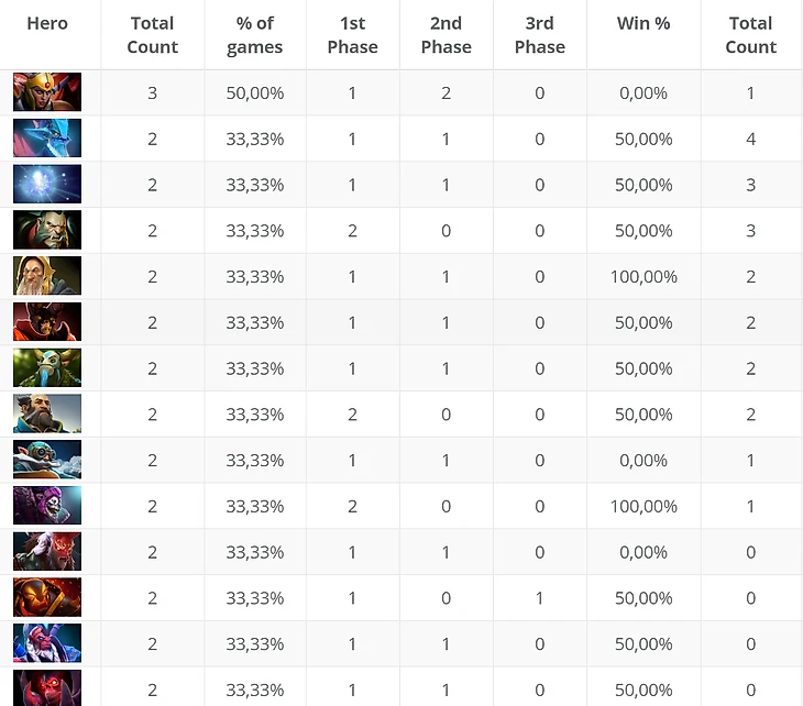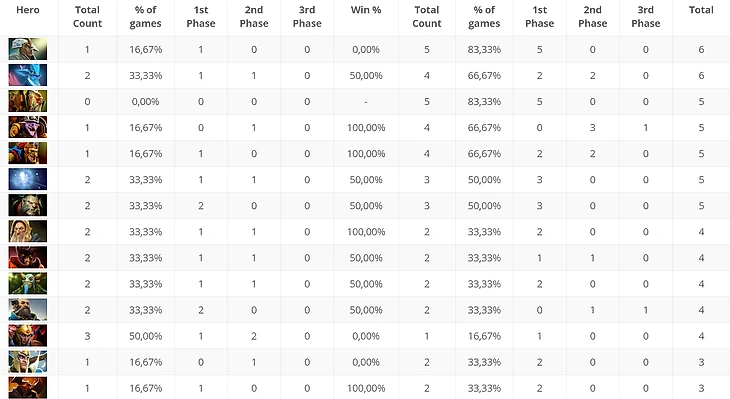 Лешрак и Чен появились на стадии драфта в 100% игр. Лон Друида не забанили всего один раз, но и не пикнули ни разу.