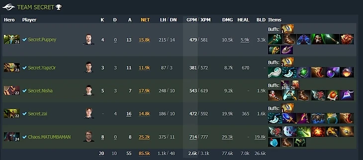 Team Secret в новом составе играют в два богатых кора и три саппорта. Заю приходится жертвовать своим фармом не только в пользу Матумбы и Ниши, но иногда и в пользу Пуппея и Япзора. Так они играли против команды Соннейко: