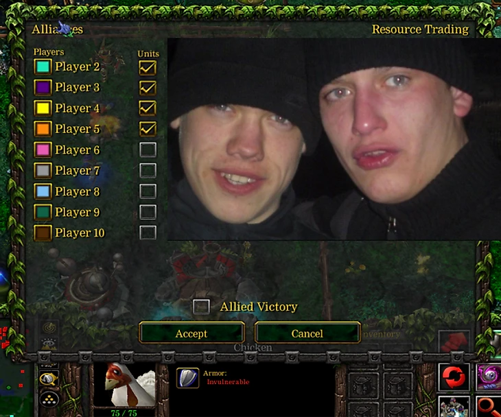 Руинерам Dota Allstars предоставляла головокружительные возможности, и связаны они были в первую очередь с курьером. Это широко известный факт, но о нем не умолчать: чтобы тиммейты могли управлять курьером, игрок, купивший его, должен был в настройках расшарить контроль на каждого союзника вручную. Причем опция расшарить только курьера появилась далеко не сразу. Так что в придачу к куре тиммейты получали опцию контролировать твоего героя и его саммонов — так, на сдачу. И в любой момент времени, например, после провальной драки, в которую ты не успел или в самой драке, или во время безобидного фарма, твой герой мог самопроизвольно прожать бкб, блинкануться в окно, а то и выложить из инвентаря шмотки и разбить их. И ты не всегда мог узнать наверняка, кто это сделал. Случалось такое не то, чтобы часто, но, думаю, ситуация знакома каждому, кто ходил в мид и шарил курьера на команду (зачастую именно мидер покупал куру за 200 монет, так как ему она нужна больше остальных). Ну сами посудите: почему бы и не разбить шмотки мидера за то, что «cc» не написал и ни разу не ганганул до 10-й? Изи.