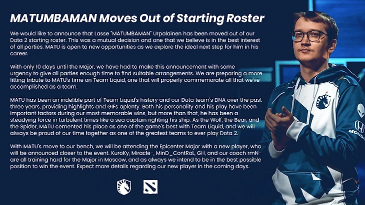 К слову, этот турнир выиграла неугомонная Team Secret, одолев в финале Team Liquid. И, казалось бы, что может пойти не так у команды, которая смогла выйти в финал мейджора? Ответ мы получили достаточно быстро. Почти сразу после окончания турнира, фанатов ждала не самая приятная новость: перевод Matumbaman в запас, что может значить только одно – этот игрок уже не нужен команде. Вот такое заявление на своем официальном сайте опубликовала организация.