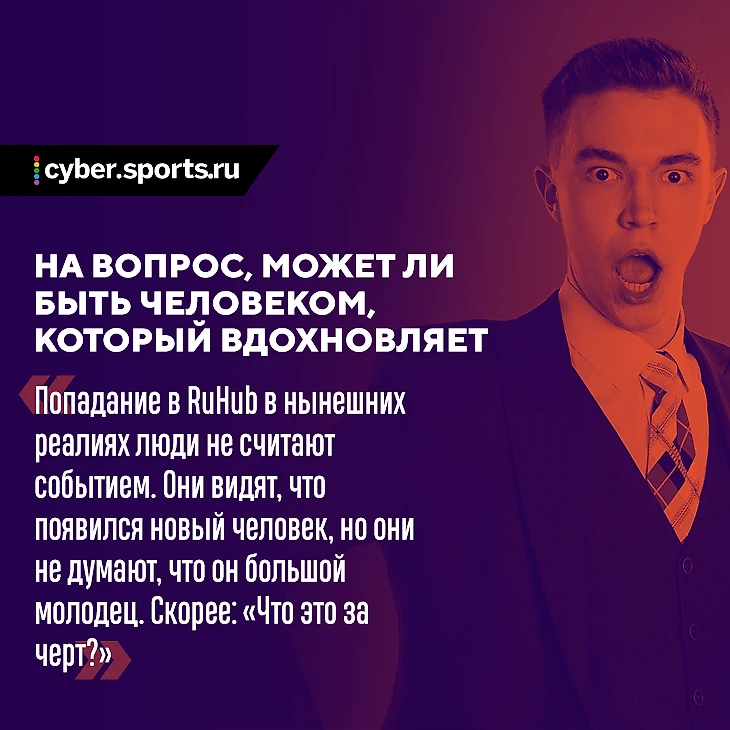 А то, что я делаю сейчас... Попадание в RuHub в нынешних реалиях люди не считают событием. Они видят, что появился новый человек, но они не думают, что он большой молодец. Скорее: «Что это за черт?» Для них будет вдохновляющим событием, если меня позовут на TI. Тогда появится список из еще 50-100 людей, которые скажут: «Блин, вы с улицы дорвались до TI! Я тоже так хочу. Спасибо, что показали, что это реально».