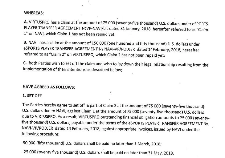В нем говорится, что сумма за трансфер Роджера составляет 150 000 долларов, а Лила – 75 000. Стороны соглашаются провести взаимозачет; итого – Virtus.pro должна выплатить 75 тысяч, 50 тысяч – до 1 марта 2018-го и 25 тысяч не позднее 31 мая 2018-го.