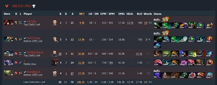 Разница в GPM – примерно +20 в пользу NAVI (погрешность), но очень сильно выделяется фарм Зайца. Потеря 70 GPM на четвертой позиции – это потеря бесплатного Форс-стаффа. Который остается на карте или достается сопернику.
