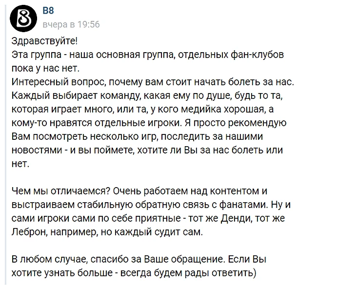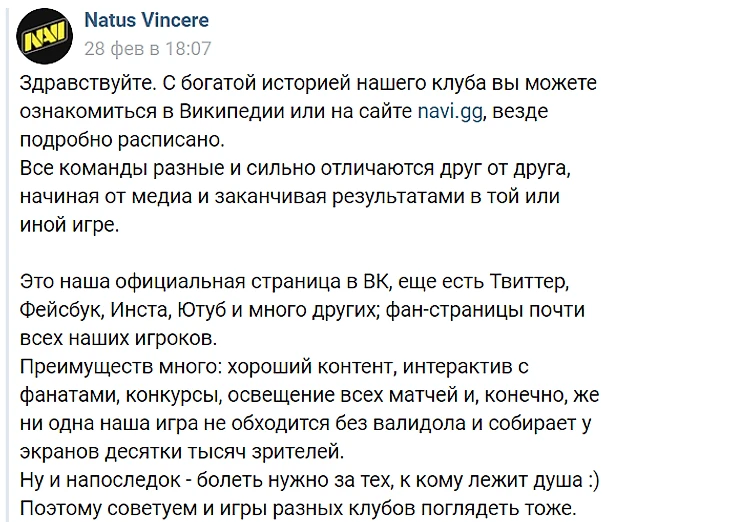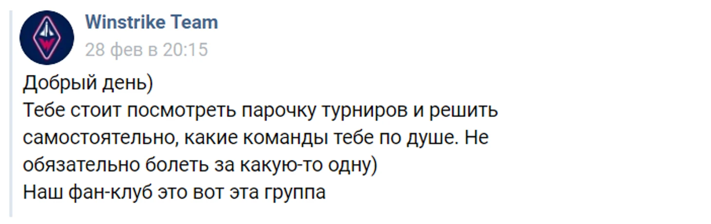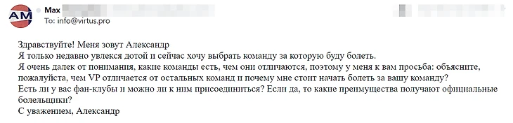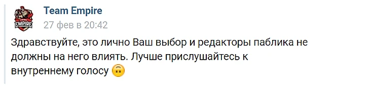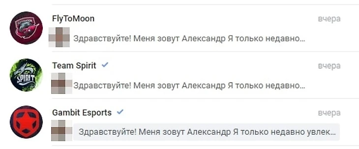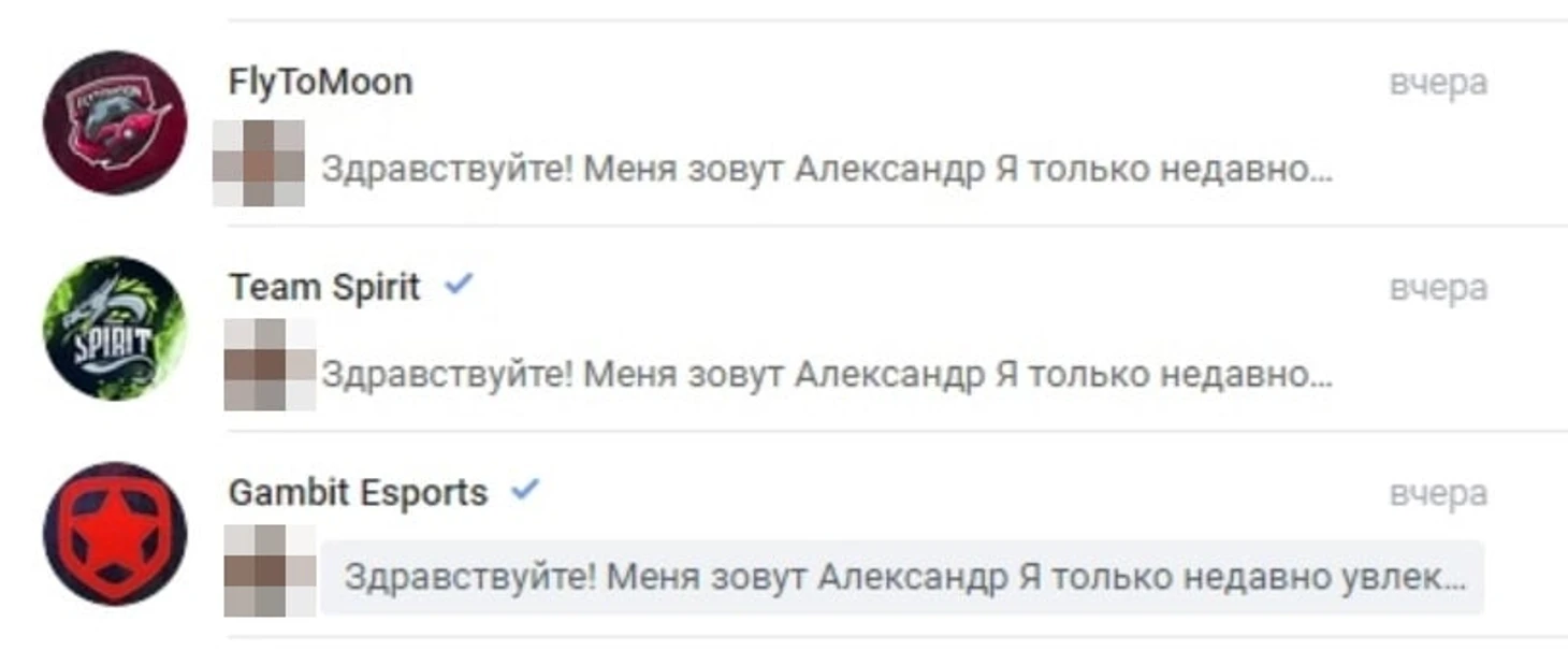 С фаворитом я определился, но решил дать остальным командам шанс меня переубедить и написал в личные сообщения сообществ. Здесь мне пришло больше ответов. Со знаком «минус» отличились Gambit, Virtus.pro, FlyToMoon и Team Spirit. У VP банально нет кнопки «Написать сообщение» – кажется, обратная связь от болельщиков их не интересует. FTM и Team Spirit прочитали, но ничего не ответили, а в Gambit даже не открыли письмо: