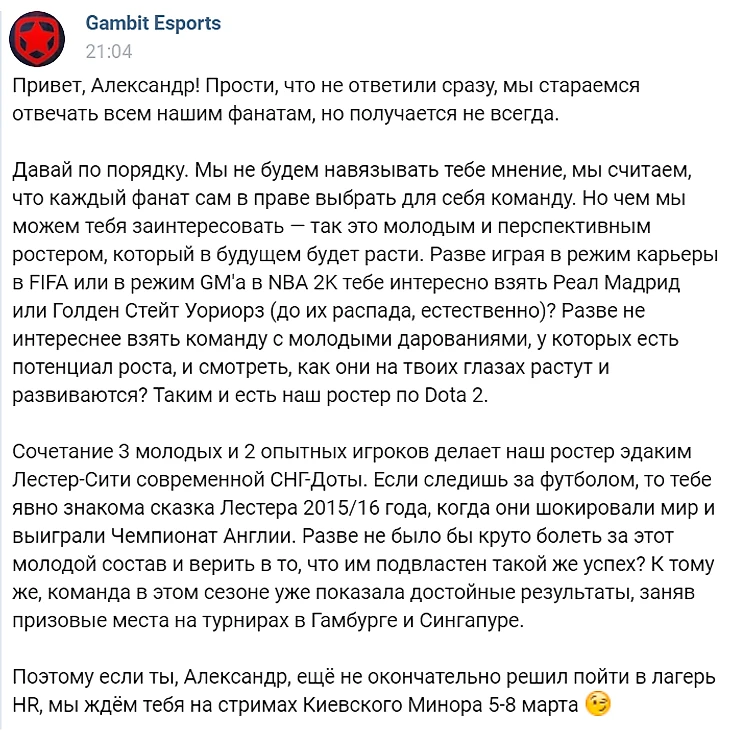 После публикации материала пришел ответ от Gambit, в котором они сравнивают себя с чемпионским Лестером и приглашают на стримы майнора в Киеве: