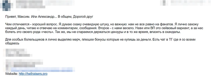 Последними ответили HellRaisers. Именно их ответ понравился мне больше всего – никакого пафоса, отличное чувство юмора и уж точно не формальная отписка. Кажется, пора заказывать себе джерси красного цвета: