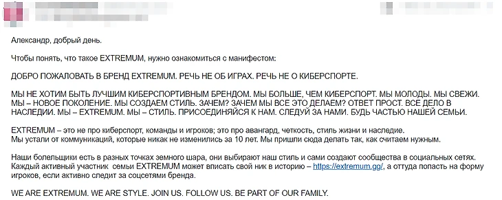 После этого я получил ответ от EXTREMUM и узнал о существовании их манифеста, любви к Caps lock и возможности попасть на форму игроков: