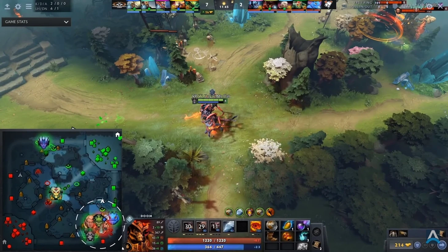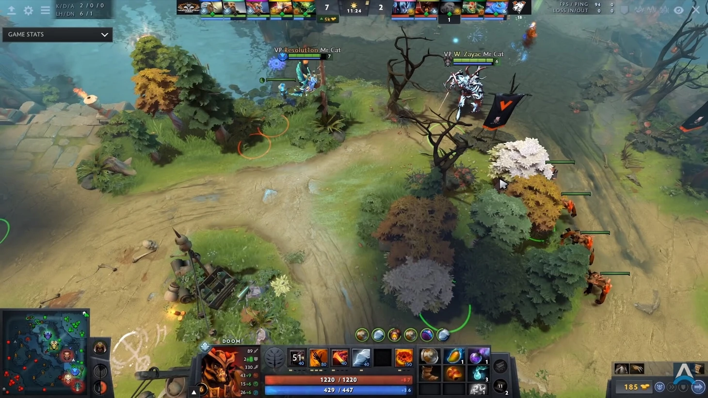 Лучшее что можно сделать для затягивания игры – просто пробежаться вперед по линии. Заяц может сделать телепорт, но он возвращается на линию, где находятся 5 противников – чтобы забрать пачку крипов и умереть. Зачем? Посмотрите на пик VP – они хотят играть в лейт, их Медуза фармит, а вражеские герои теряют время в погоне за Думом: