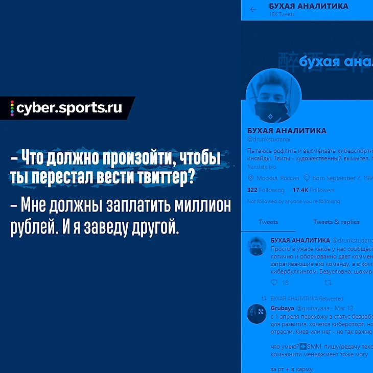 Ведущий твиттера «Бухая аналитика» общается с про-игроками, но не хочет работать в киберспорте. Он дал большое интервью, в котором рассказал: