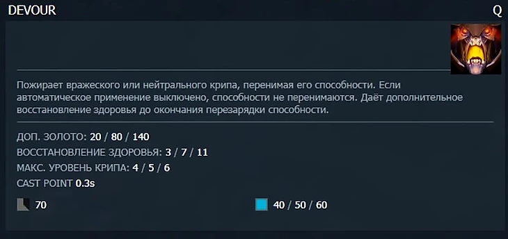 Но вот четвертый уровень Devour уже не так полезен – крипов мы и так едим всех, а к седьмому уровню у оффлейнера стадия линий обычно заканчивается, и эффективность регенерации резко понижается.