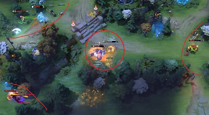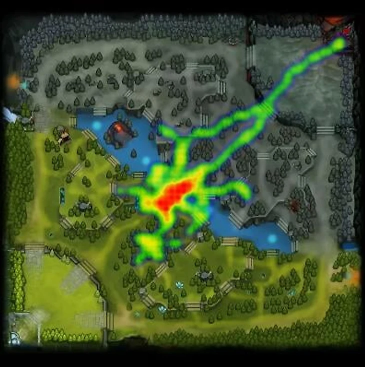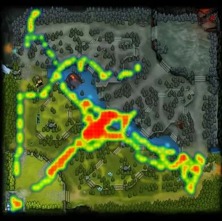 Нун на Паке показал выдающуюся игру. К 10-й минуте он инициировал 3 убийства кор-героев противника (каждого по разу) своими перемещениями. С 6-й минуты он использовал Dreamcoil почти по его кулдауну (3 раза за 4 минуты при кд 70 секунд). Карта его перемещений по карте до 12-й минуты для большей наглядности: