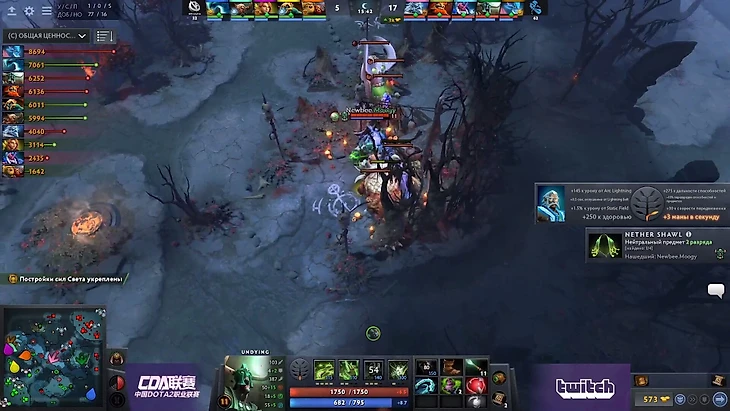 Зомби-керри на первые деньги принес себе 2 маски на регенерацию маны, чтобы спамить первым скиллом, а потом собрал из них Некрономикнон, который позволял ему фармить лес.