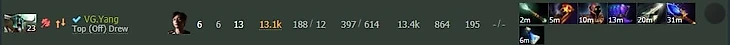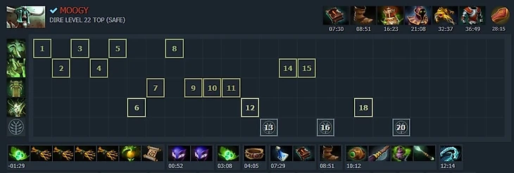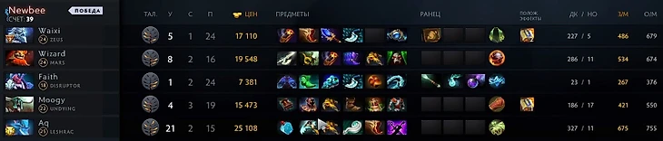 Как видите, Moogy на этом этапе уже больше держится за спинами союзников и почти не бьет с руки. После покупки Вессела он фактически стал четверкой, что подтверждает итоговый фарм.