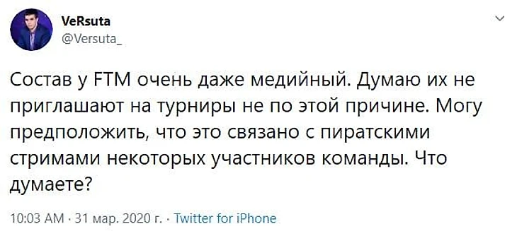 Он также отмечал, что FTM напрямую писали ESL и спрашивали про возможность участия в турнире, но им отказали: «У ESL остается еще один или два слота, и когда мы им пишем и спрашиваем о возможности игры на этом турнире, люди отказывают. Чем побеждают нас Cyber Legacy/Team Spirit/Gentleman/B8 на данный момент я не особо понимаю. То, что на эти турниры нет опен квалы – это вообще провал полный».