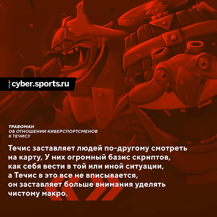 – На мой взгляд, Течис заставляет людей по-другому смотреть на карту, им надо перестроить свой ход мыслей. Не знаю, как на низких рейтингах, но точно скажу, почему прошникам не нравится Течис. У них есть огромный базис скриптов, как себя вести в той или иной ситуации из-за опыта, а Течис в это все не вписывается, он заставляет больше внимания уделять чистому макро. Очень непривычно для людей, которые считают себя компетентными, которые считают, что лучше других понимают, что происходит. Им приходится перестраиваться. Для более низких рангов, думаю, происходит похожим образом.