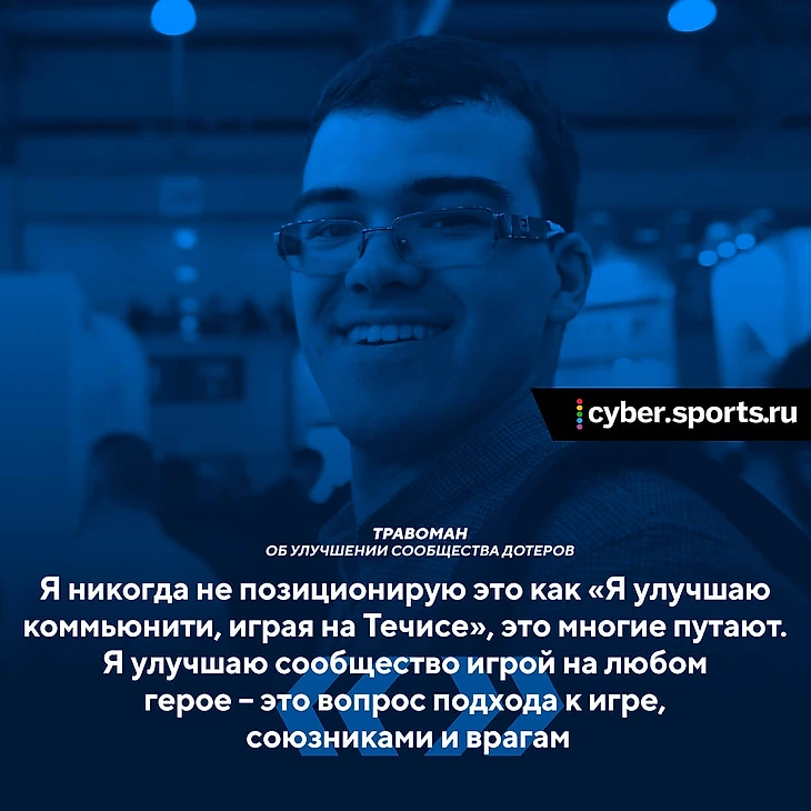 – Наверно, людей коробит из-за того, что я играю на Течисе и улучшаю комьюнити. Но я никогда не позиционирую это как «я улучшаю коммьюнити, играя на Течисе», это многие путают. У того же Дахака видел название стрима: «Не улучшаю коммьюнити (не играю на Течисе)». Но мое улучшение сообщества не зависит от героя – это вопрос подхода к игре, союзниками и врагам. Я показываю аудитории, что можно играть в Доту не ругаясь и получая удовольствие.