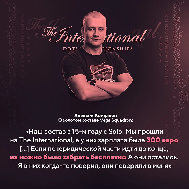Хотя у меня был такой пример – наш состав в 15-ом году с Solo. Мы прошли на The International, а у них зарплата была 300 евро. Им поступали вполне хорошие предложения, да и контракты у нас были такие себе, если честно. Если по юридической части идти до конца, их можно было забрать бесплатно. А они остались. Но дело было в доверии. Я в них когда-то поверил, они поверили в меня. Solo и ребята всегда входили в мое положение. Но больше я такого отношения не вспомню. И думаю, в текущих реалиях такое вряд ли повторится.