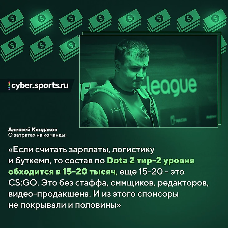 Если считать зарплаты, логистику и буткемп, то состав по Dota 2 тир-2 уровня обходится в 15-20 тысяч, еще 15-20 – это CS:GO. Это без стаффа, сммщиков, редакторов, видео-продакшена. И из этого спонсоры не покрывали и половины. Еще есть призовые (хотя считается, что включать их в бизнес-модель неправильно), иногда подворачивались удачные трансферы. А все остальное – это средства инвестора. От этих денег мы очень сильно зависели.