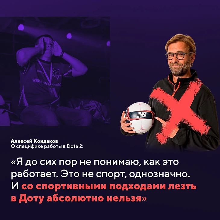 В Доте все вообще не так просто. Как я люблю говорить: здесь все идет наперекор логике, все от обратного. Ты пробуешь из них сделать киберспортсменов, находишь тренеров, психологов, буткемп. А потом мы можем внезапно увидеть ситуацию, когда вновь собранный стак может спокойно обыграть именитую команду. После провальной квалификации в 2018 году у меня была мысль, что правильнее всего было бы за месяц до квал поменять половину состава и просто онлайн отыграть квалификации. Без всяких буткемпов и заморочек. Шансов пройти у нас было бы куда больше, поверьте.