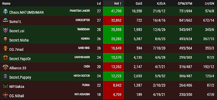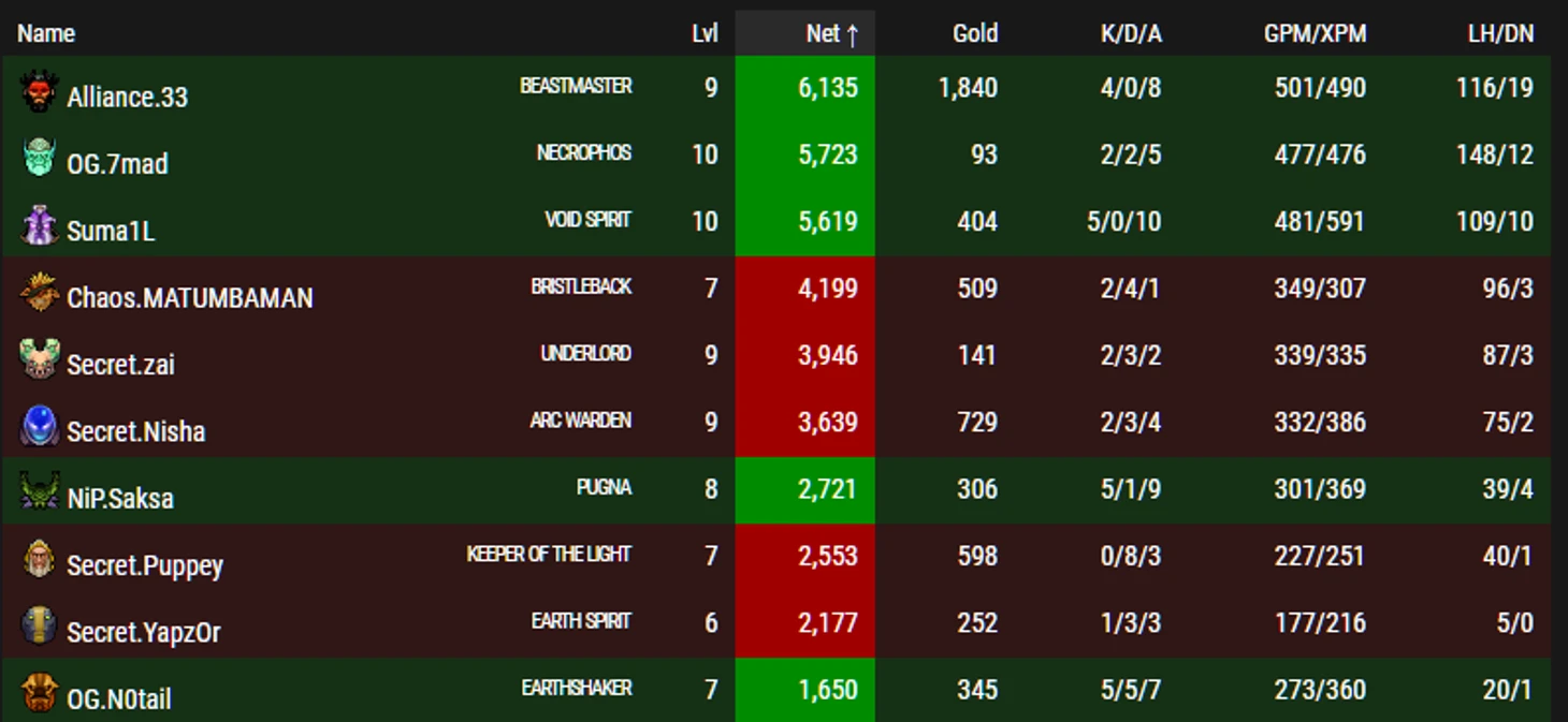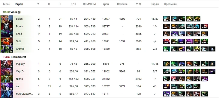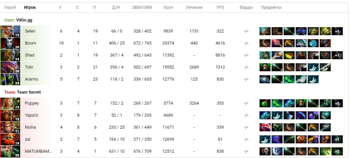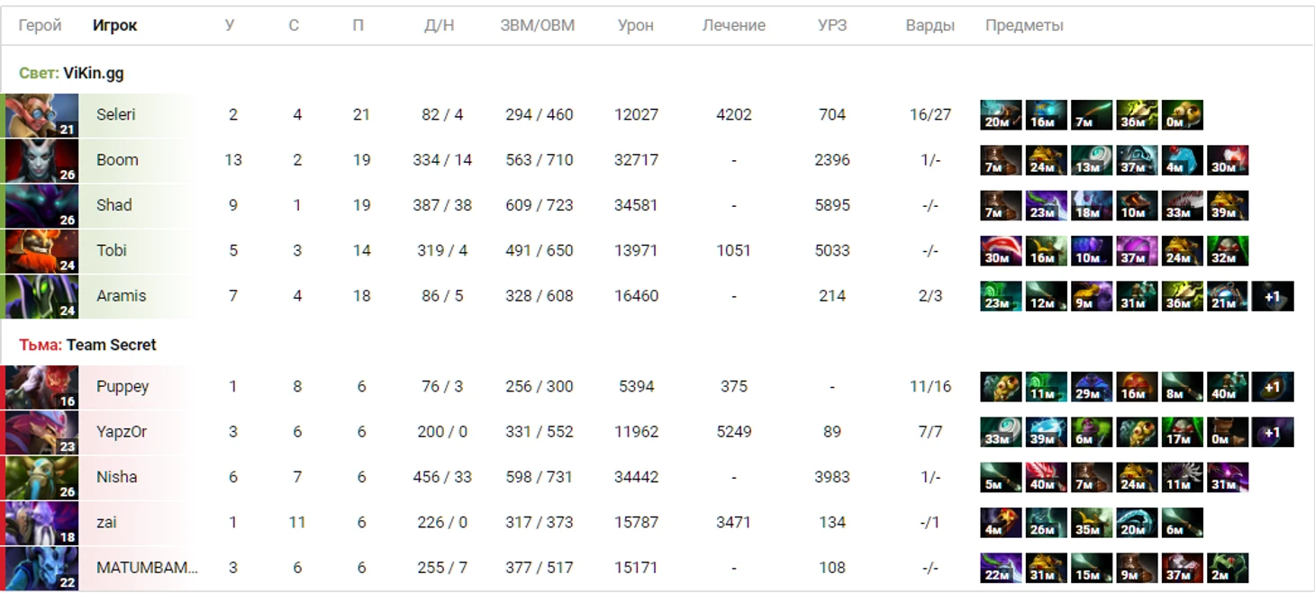 Ну если вкратце, то Secret вылетели. А подробнее? Ну если подробнее, то в первом матче Сикрет попали на ОГ, которые заняли второе место в группе А. Первая карта закончилась за 19 минут победой OG, коры которых не умирали, но убивали. С первой картой было все понятно, ОГ просто перепикали. А если быть точнее, то Сикреты недопикали, потому что Бристлбек на первой и Арк Варден на второй позиции были явными ошибками. Вот статистика первой карты.