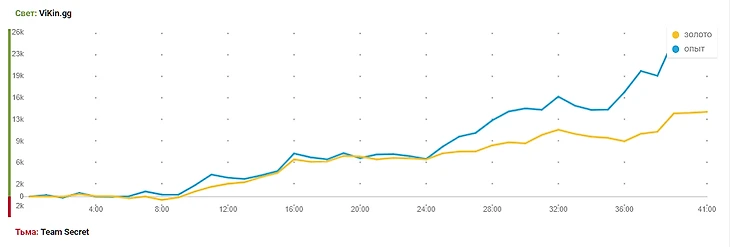 Ну так да, туда они и попали после поражения. И играли рни с VIKIN.gg, которые до этого выиграли Alliance. И тут в Сикретов точно все поверили, так как ладно еще OG с их звездным составом, а тут какие-то (ну не какие-то) Викинги с интернациональным составом (преимущественно европейским (а нет, полностью европейским, Израиль же Европа)). Так эти Ваши Викинги проиграли Ашерам, которые никуда не вышли и Нигме, которая уже вылетела. А у нас тут 7-0 в группе было, так что давайте по-быстрому с Вами разделаемся и пойдем некст играть. А не тут-то было. Викинги вынесли (ВЫНЕСЛИ!!!) Сикретов в две карты. Да, обе карты длились по 40 минут, но по счету и графикам все понятно. Описывать я их так подробно не буду, потому что они не такие интересные, но вот статистика и графики первой карты, где видно, что Викинги стабильно только наращивали преимущество и выиграли со счетом 36:14: