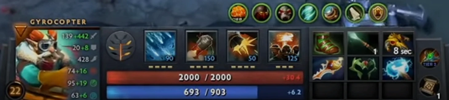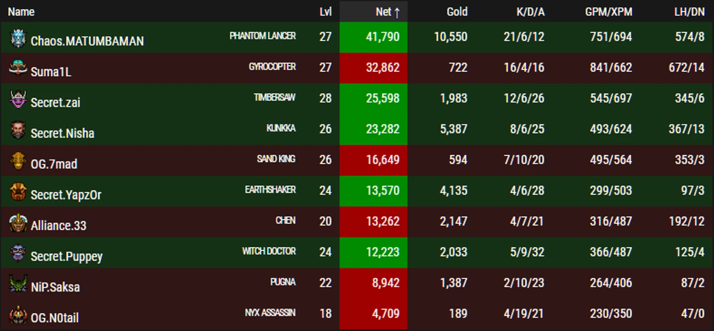 35:00---40:00: у Лансера Годлайк и на 6к больше золота, чем у Гирокоптера. Пугну убили, Гиро купил Рапиру. Затем затыкали Тимбера, который загулял. Потом пошли бить Рошана, Лансер ливнул, но перезашел. Аегис достался Лансеру. Счет 37:17, а перефарм Сикрет 24к. Вот как забавно выглядел билд Гиро: