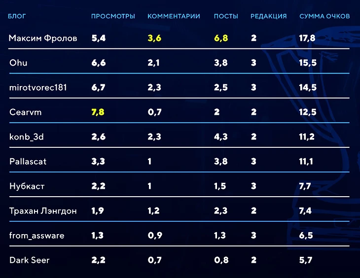 Вот как выглядит топ блогеров по итогам месяца. Для подсчета результатов мы использовали такую формулу: просмотры блога за месяц/1000+количество комментариев под постами/15+0,25 балла за обычный пост или 0,75 балла за пост, который попал на главную+мнение редакции (от 0 до 3).