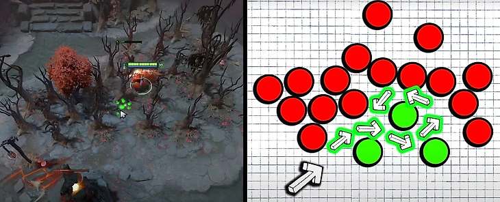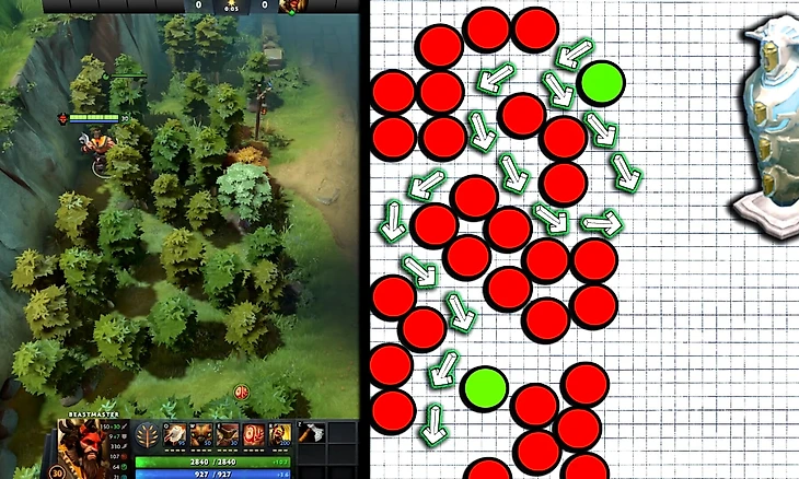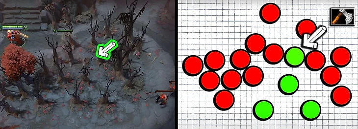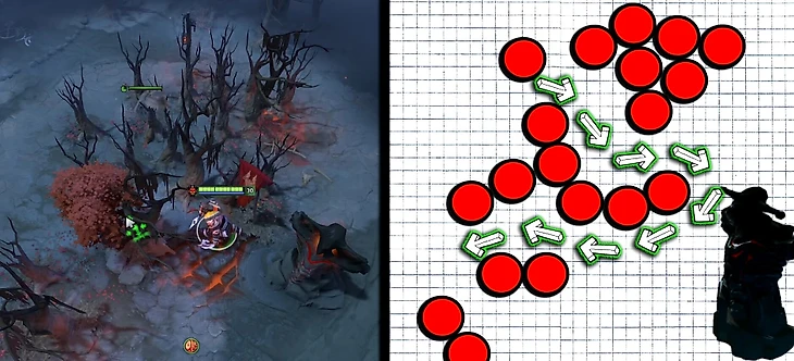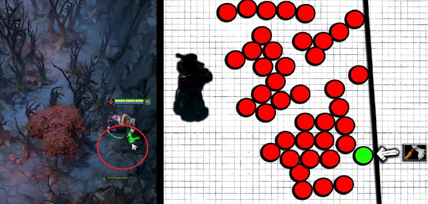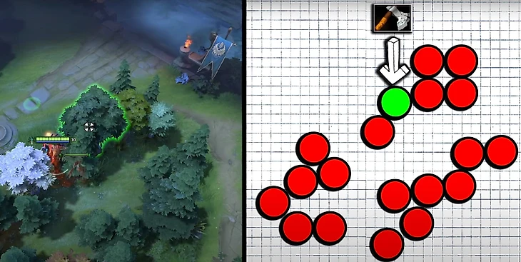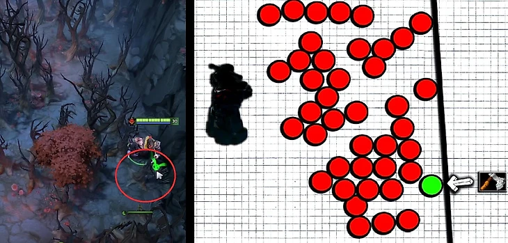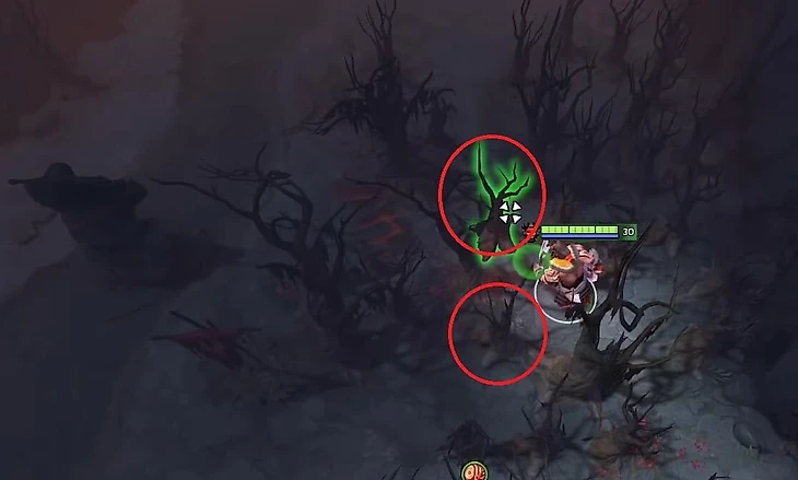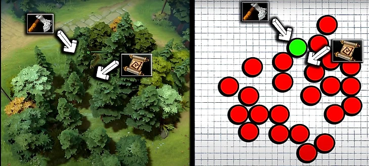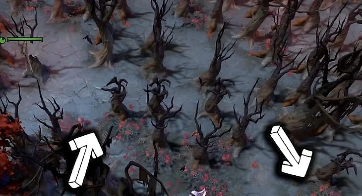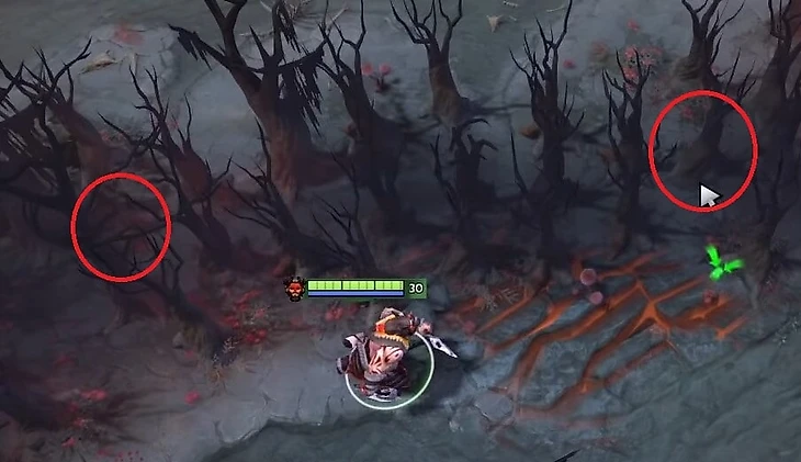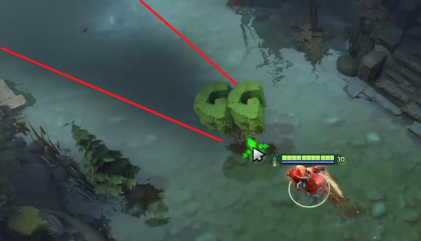 Дерево блокирует вам в обзор в конусе, угол раскрытия которого зависит от расстояния до дерева. Чем ближе вы к дереву, тем конус шире. Такое свойство позволяет деревьям быть одним из самых важных сейвов в Доте.