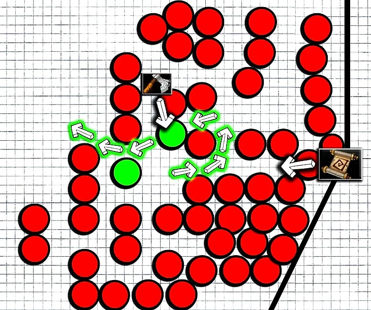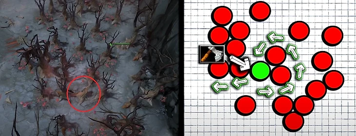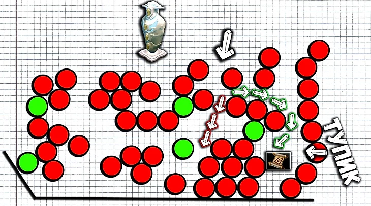 Лучше всего использовать маршрут, обозначенный зеленой линией. Противник ожидает, что вы просто пройдете через лес, поэтому не будет разворачиваться вокруг центрального дерева.