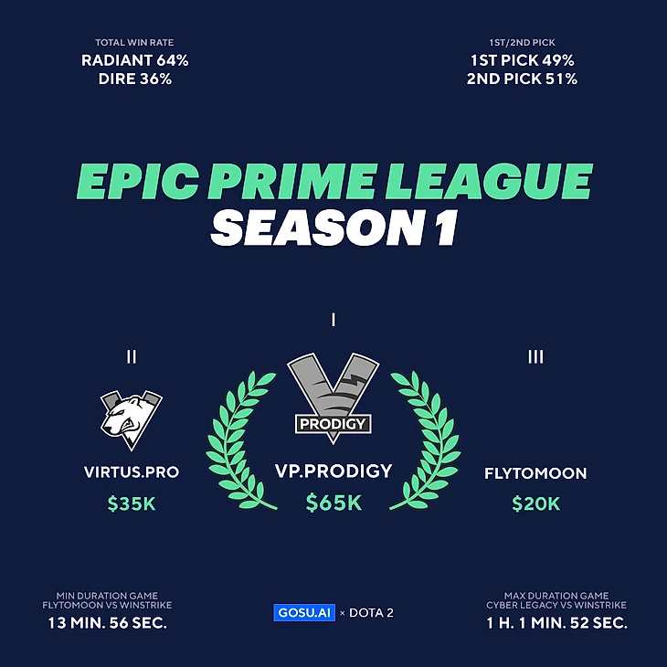 Одна команда оказалась значительно сильнее остальных. Мы хотим поздравить победителя первого сезона Epic Prime League - Virtus Pro Prodigy. В интереснейшем финале ребята сумели одолеть самого важного для них оппонента - основной состав организации Virtus Pro, причем сделать это с разгромным счетом 3:0.